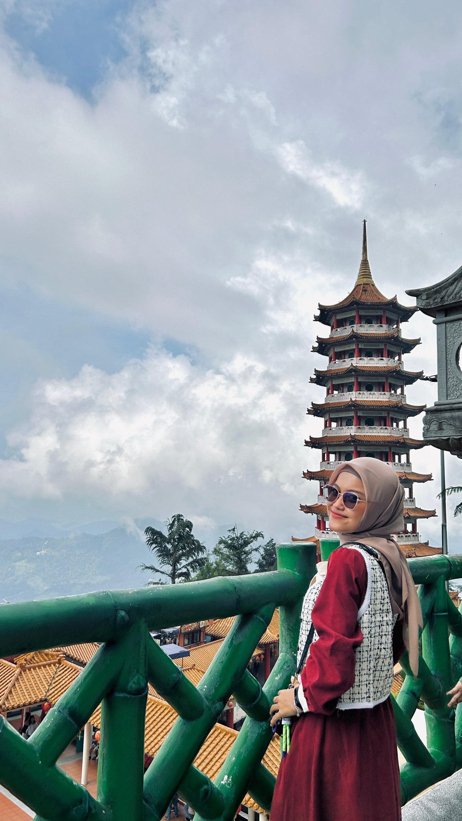 Chin Swee Caves Temple di puncak Genting Highlands, Pahang, Malaysia, menawarkan pemandangan yang menakjubkan. Gabungan arsitektur yang rumit dan patung Buddha yang besar, dengan latar belakang pegunungan yang berkabut, menciptakan pemandangan yang dramatis dan penuh keagungan.