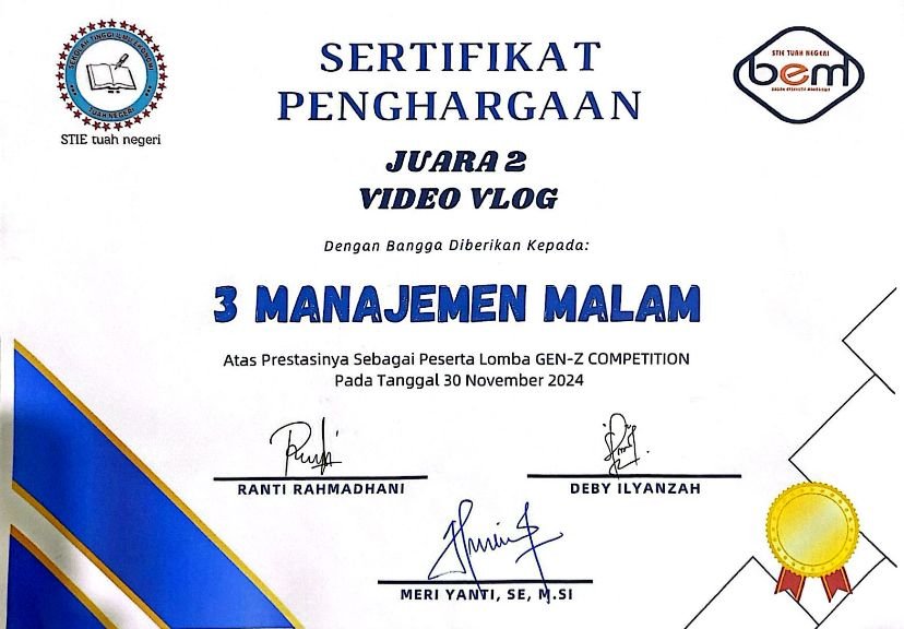 Keterlibatan saya dalam Lomba Video Editor antar kelas, yang menghasilkan Juara 2, menunjukkan kemampuan kepemimpinan dan proaktif saya dalam mencapai tujuan bersama.